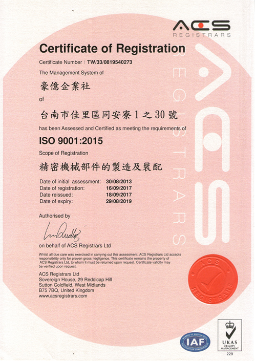 豪億企業社創立於西元1995年12月,從事真空零件/中心圈專業製造及快速接頭系列等,提供客戶良好品質及 優良的服務。 公司全體同仁以持續改善之管理精神,以及謙和的態度服務顧客,並秉持著”樸實勤奮、誠信服務”之經營理念 ,於考量客戶期望下訂定”品質第一、效率至上”的政策,持續改善本公司產品及服務品質,滿足客戶的需求。 ISO9001:2015認證